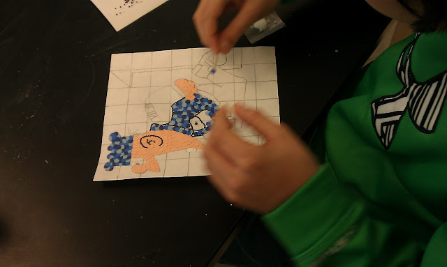 7th grade 2-D students studied the word of Seurat and his use of many colors of painted dots to create a work of art. They learned about pointillism and how the eye will blend various colors together. Students then drew a cartoon or comic book character using the grid method to enlarge and begin using hole punches to make the little dots. Students also discussed collage and learned that a collage has been around since the 10th century but didn't get it's name until Picasso and Braque coined the term in the beginning of the 20th century. Students would be creating a pointillism collage of their own by mixing different shades of dots. Craftsmanship is very important on this project or else they would end up with a gluey mess. The projects are not finished yet but here they are in progress...